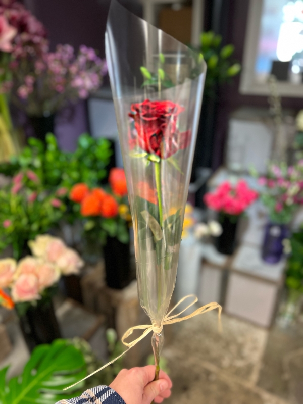 A beautiful Red Rose wrapped in cellophane with a raffia bow. A simple but wonderful way to say "I Love You"