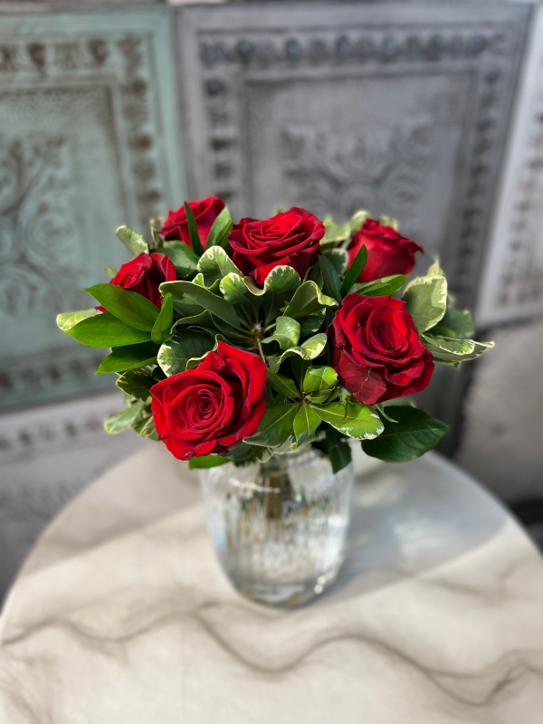 A beautiful display of 6 red roses available in either a hand tied gift box arrangement or in a vase