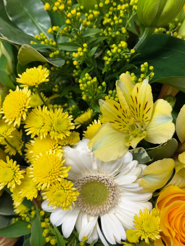 A bouquet of stunning sunshine yellow flowers with gorgeous foliage accents.